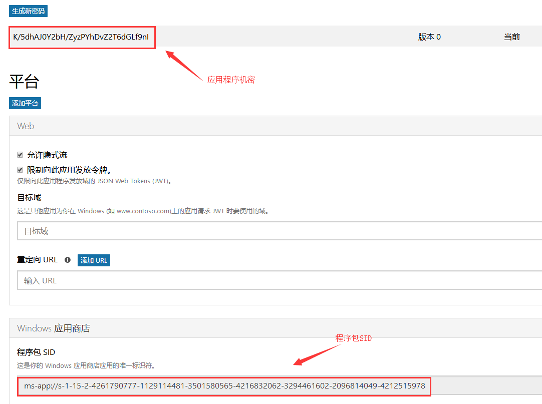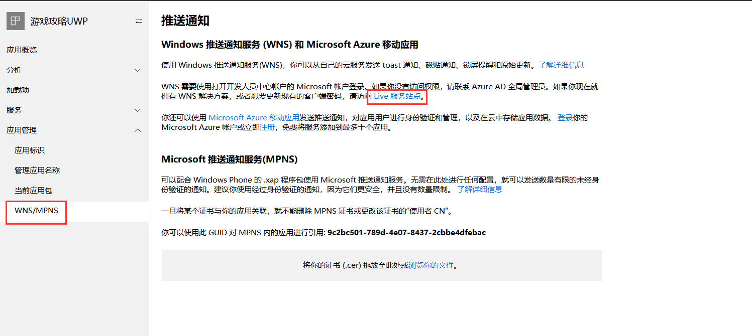 微软后台点击WNS/MPNS,点击Live服务站点,获得程序包SID,应用程序机密参数后,直接复制,粘贴到MG后台